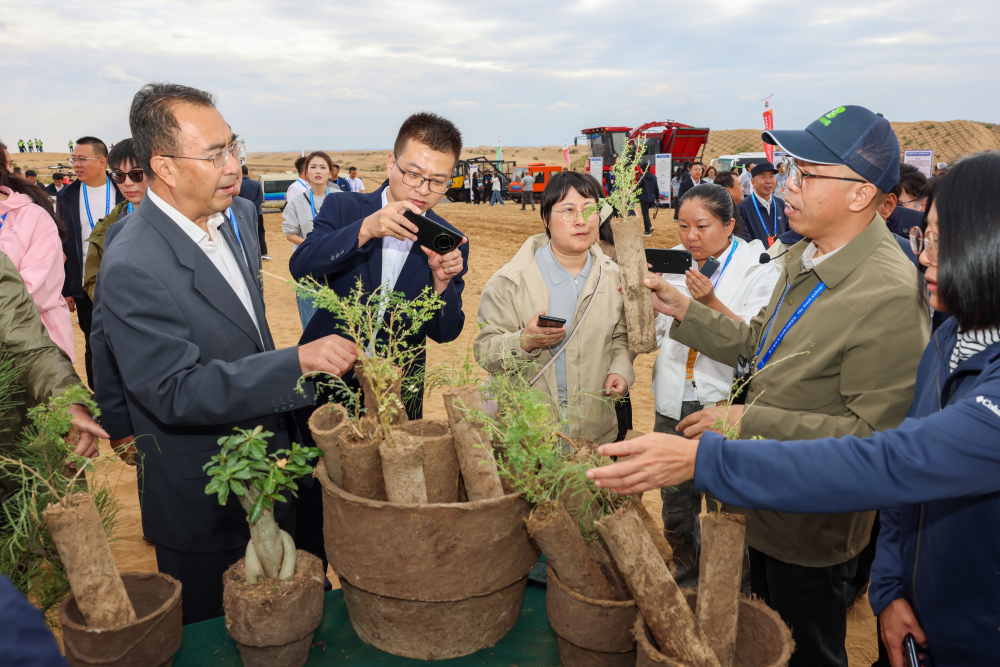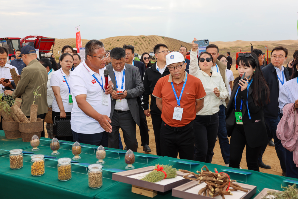9月16日,在以路治沙示范区参观点,工作人员为第十届库布其国际沙漠论坛与会者介绍沙生植物产品。(赵鑫磊 摄)
