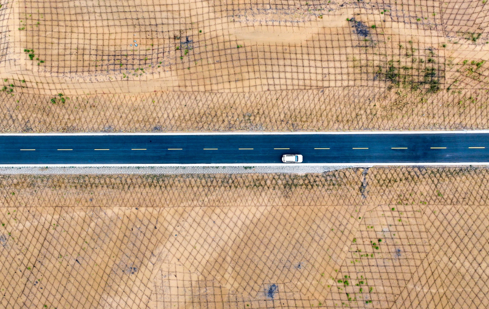 9月16日,第十届库布其国际沙漠论坛与会者参观库布其沙漠鄂尔多斯市达拉特旗以路治沙示范区(无人机照片)。(王正 摄)
