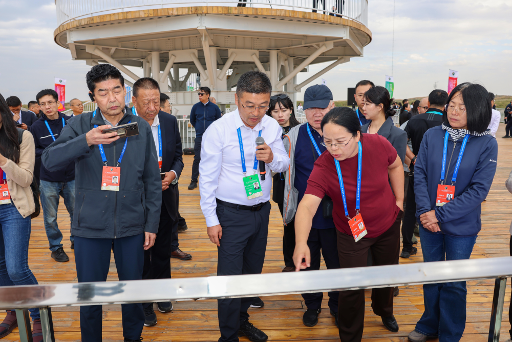 9月16日,第十届库布其国际沙漠论坛与会人员参观鄂尔多斯“沙戈荒”中北部新能源大基地。(赵鑫磊 摄)