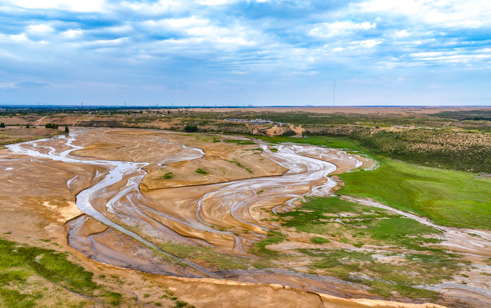 9月16日拍摄的库布其沙漠鄂尔多斯市达拉特旗黑赖沟孔兑综合治理区景色(无人机照片)。(王正 摄)
