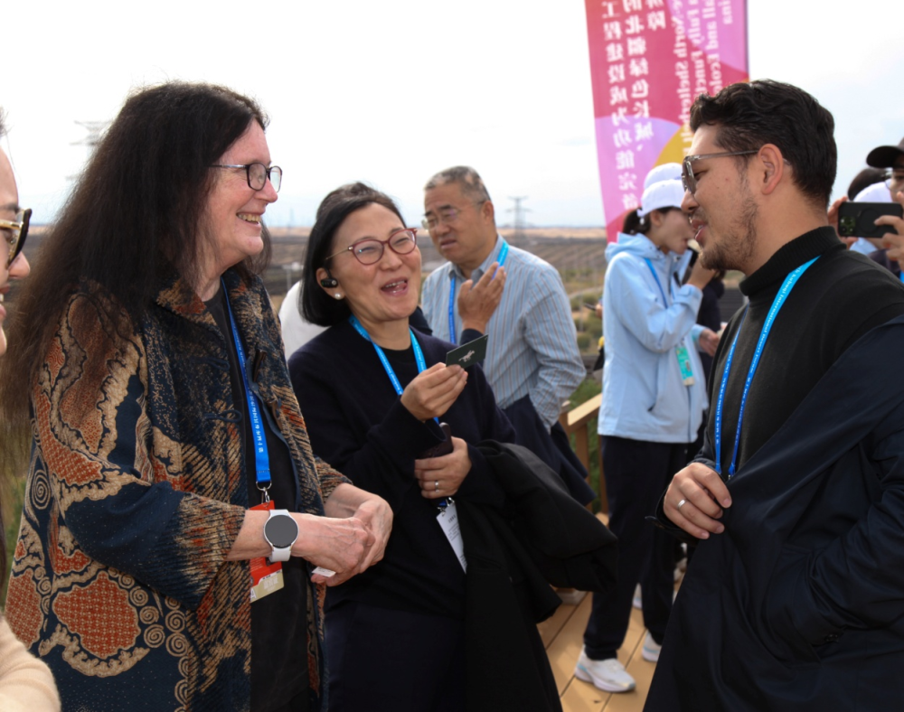 9月16日,在第十届库布其国际沙漠论坛期间,与会人员实地参观库布其北缘锁边林带、鄂尔多斯“沙戈荒”中北部新能源大基地、以路治沙示范区以及黑赖沟孔兑综合治理区,充分了解鄂尔多斯市多举措综合治沙的丰硕成果。