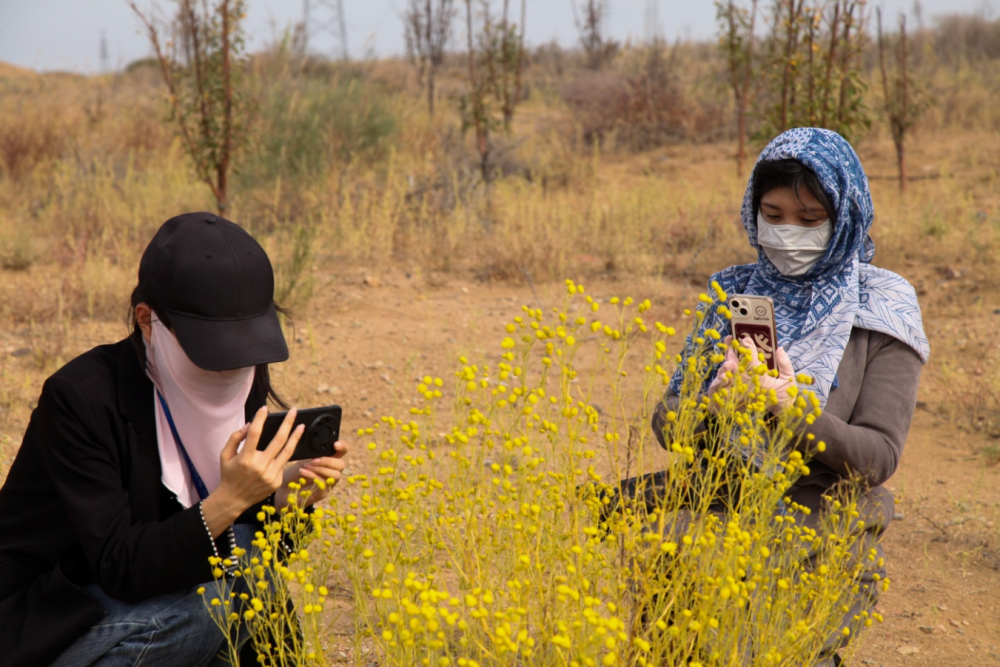 9月16日,第十届库布其国际沙漠论坛与会者在鄂尔多斯“沙戈荒”中北部新能源大基地拍摄植被。(李爱武 摄)