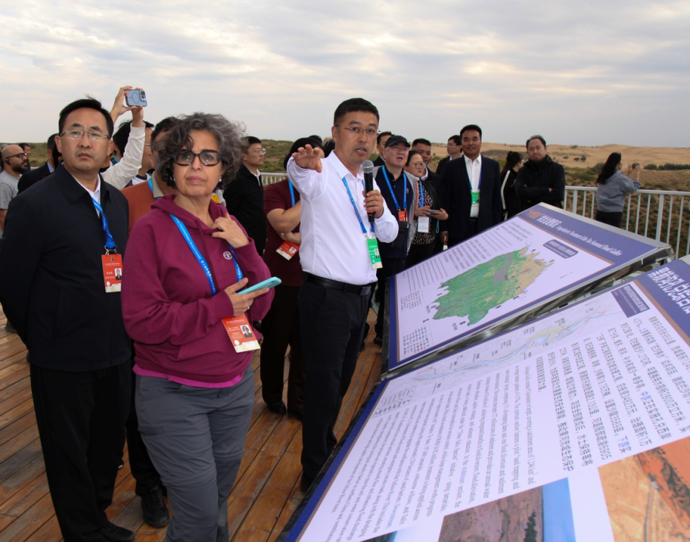 9月16日,在鄂尔多斯市以路治沙示范区参观点,工作人员为第十届库布其国际沙漠论坛与会者介绍治沙技术。(赵鑫磊 摄)