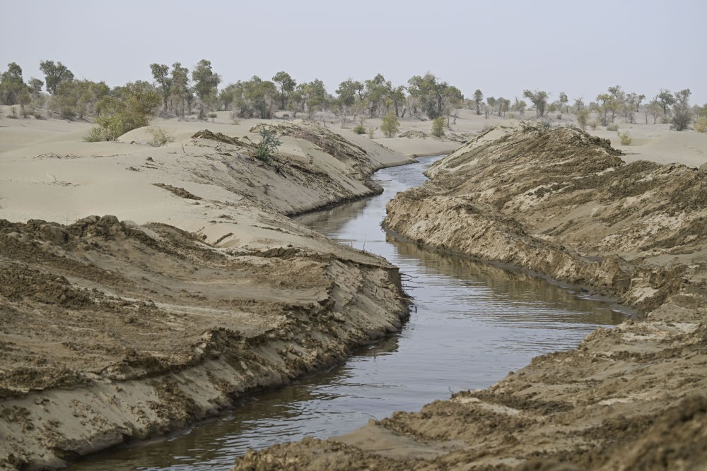 2025年9月19日在新疆巴音郭楞蒙古自治州尉犁县境内的塔克拉玛干沙漠拍摄的人工挖掘的引洪补水生态渠。新华社记者 王菲 摄