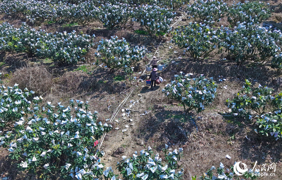 被银色果袋包裹着的枇杷挂满了枝头,让整片山银装素裹,宛若雪景。人民网记者 李昌乾摄