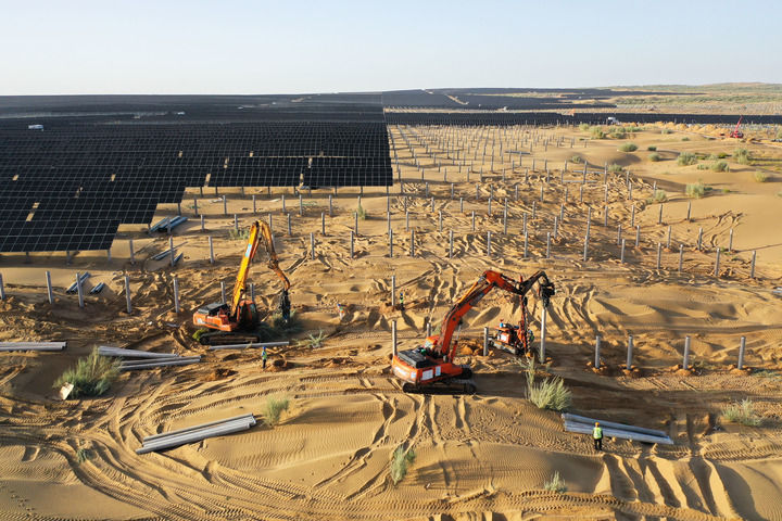 2025年9月2日,工程机械在库布其沙漠里的鄂尔多斯市杭锦旗朔方新能源大基地施工(无人机照片)。新华社记者 李志鹏 摄