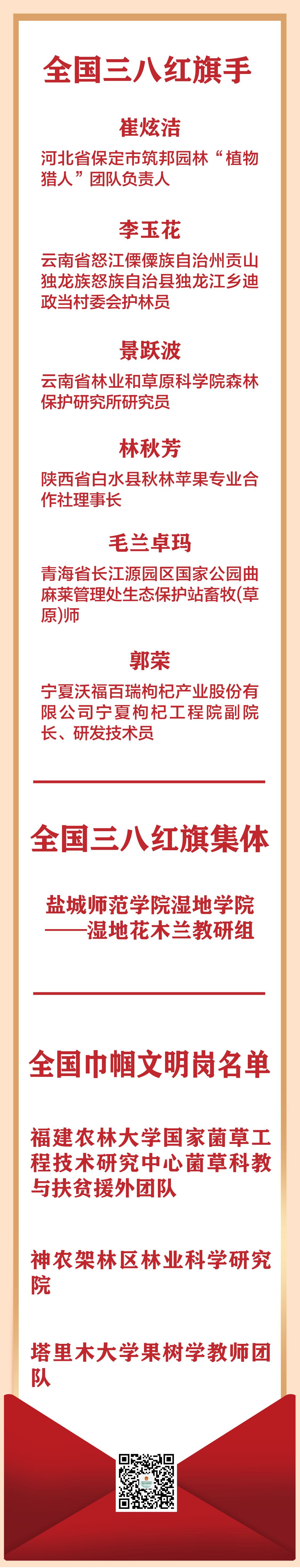3月2日,全国妇联公布了2025年度全国三八红旗手标兵、全国三八红旗手、全国三八红旗集体、全国巾帼文明岗名单。其中,林草系统多名个人、多个集体被授予光荣称号。