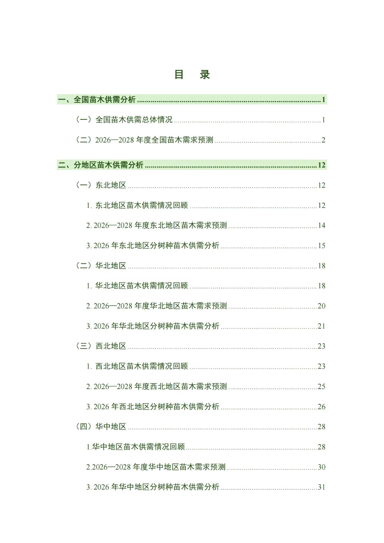 为有效缓解种苗供需结构性矛盾,引导苗木生产经营者合理安排生产,推进林草种苗事业高质量发展,国家林业和草原局国有林场和种苗管理司组织北京林业大学、全国(合肥)苗木花卉交易信息中心和中国经济信息社,根据当前我国国土绿化和生态保护修复的形势与任务、以及种苗生产实际情况,对2026年全国苗木供需情况进行了分析,编制完成了《2026年度全国苗木供需分析报告》,于11月1日正式发布。