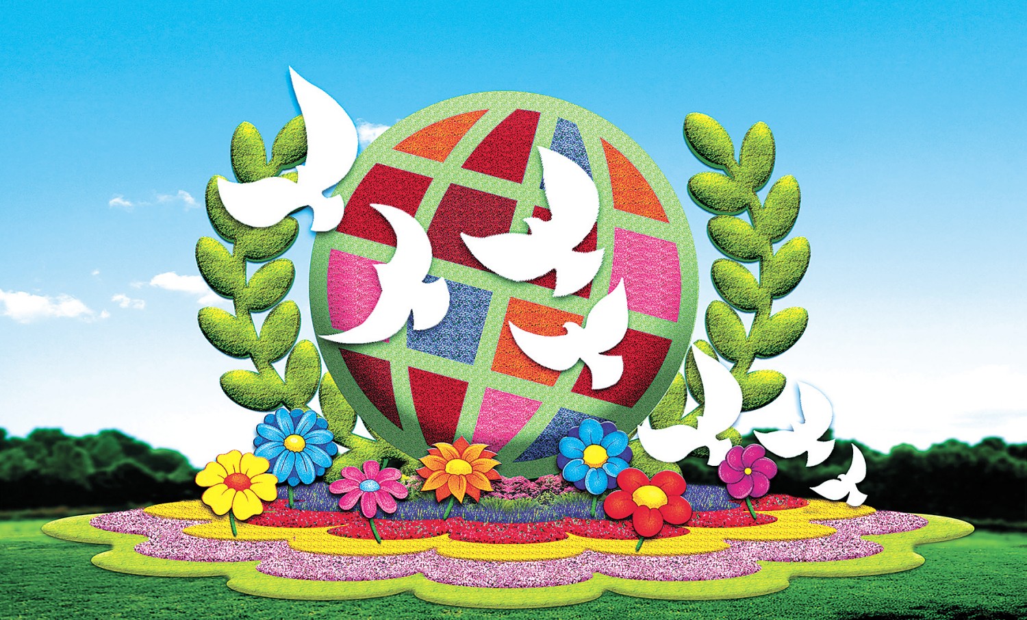 篮内选取了美好寓意的花卉,其中荷花寓意和和美美、月季寓意和平希望、珙桐寓意和平之树、橄榄枝寓意荣耀和平、向日葵寓意自由幸福、山丹丹寓意团结奋进、英雄花寓意英勇无畏,结合和平鸽元素,体现“和平发展、欣欣向荣”,表达对祖国繁荣富强的美好祝福,对世界和平发展的美好期盼。