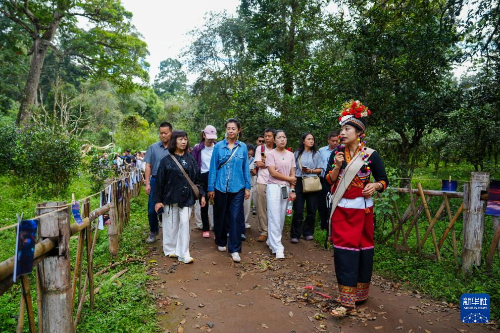 9月27日,一名工作人员在景迈山大平掌古茶园为游客讲解。