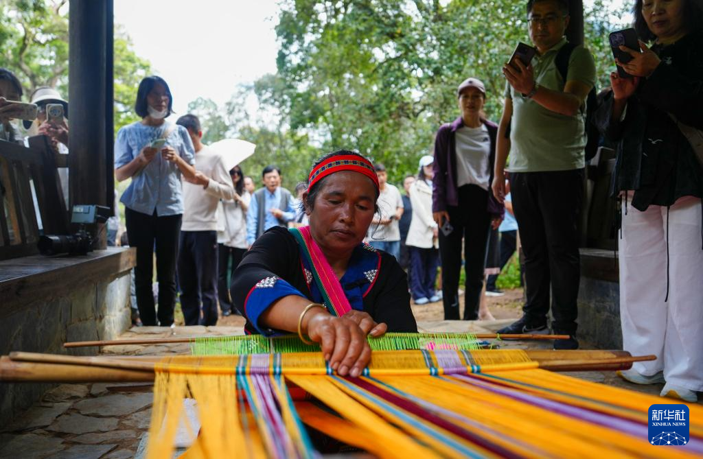 9月27日,一名当地村民在景迈山大平掌古茶园为游客展示织锦技艺。