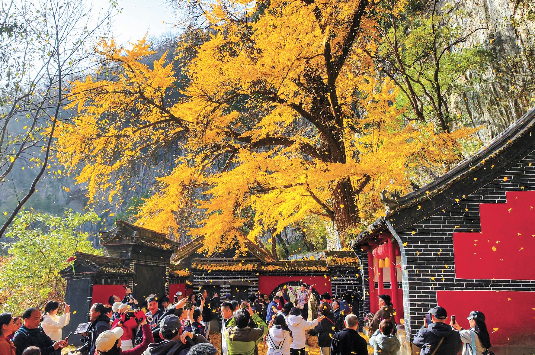 深秋时节,银杏的金黄树冠与红墙、山崖相映,落叶铺就的“金色地毯”成为汉服爱好者的天然布景,随手一拍便是古风大片。“看银杏叶落下来的时候,心里非常愉悦,心情自然放松下来。”游客小心翼翼地从树下拾起一片完整的银杏叶,语气里满是沉醉。