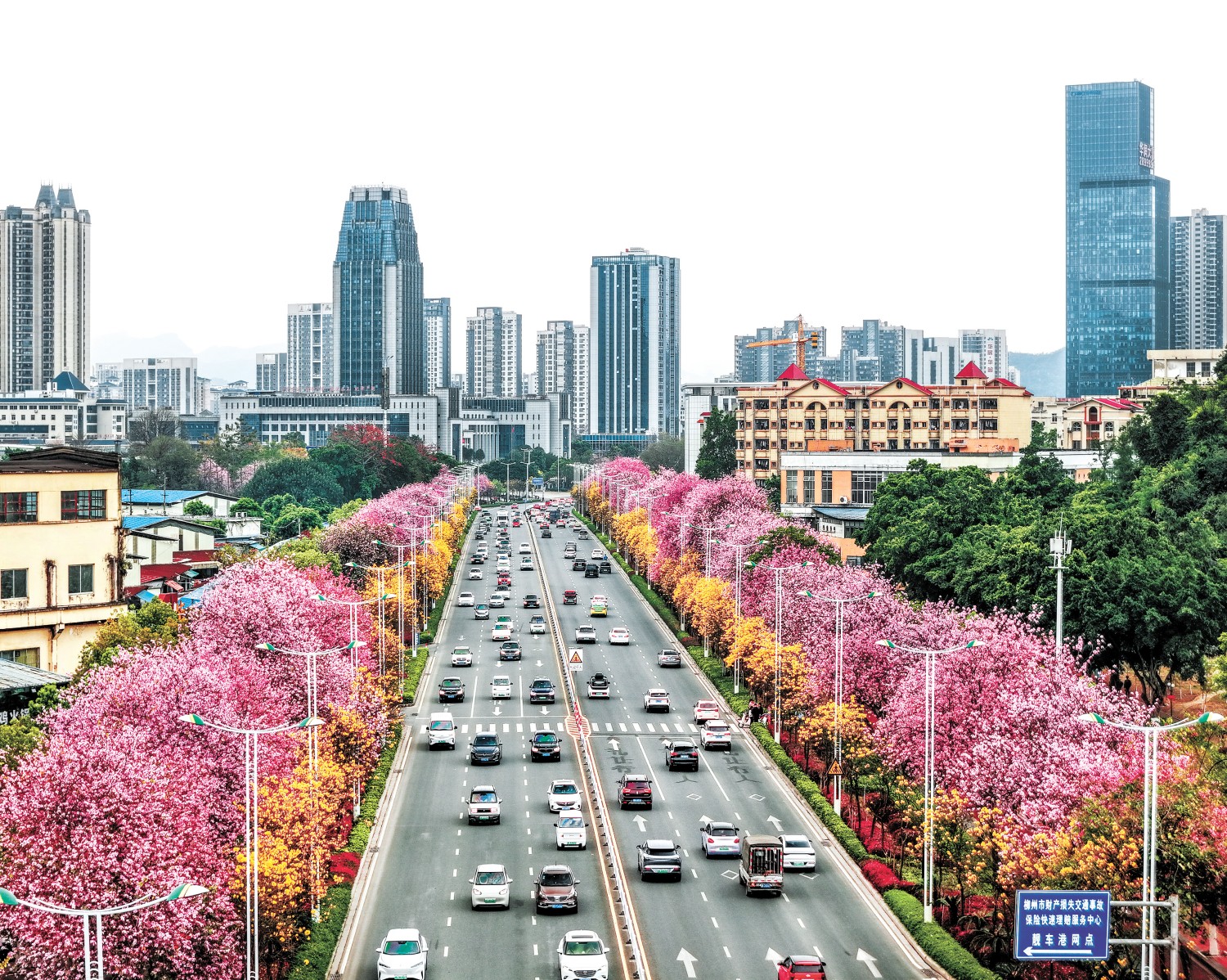 目前,柳州城区紫荆遍布主次干道、公园广场与柳江沿岸,形成“一路一花、一街一景”的城市画卷。市民推窗见绿、出门入园,在家门口便能拥抱春天。航拍视角下,花海与楼宇相映,尽显“春花之都”的浪漫生机。