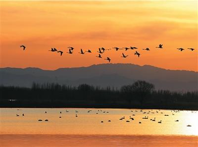 河北省张家口市官厅水库国家湿地公园的天鹅展翅飞舞。孙慧军摄(人民图片)