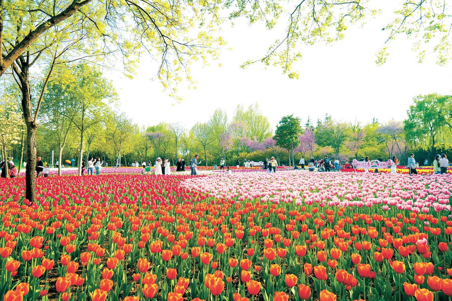近日,随着气温回升,河南郑州绿博园近百万株郁金香渐次绽放,涵盖70余个品种,吸引众多游客前来观赏。
