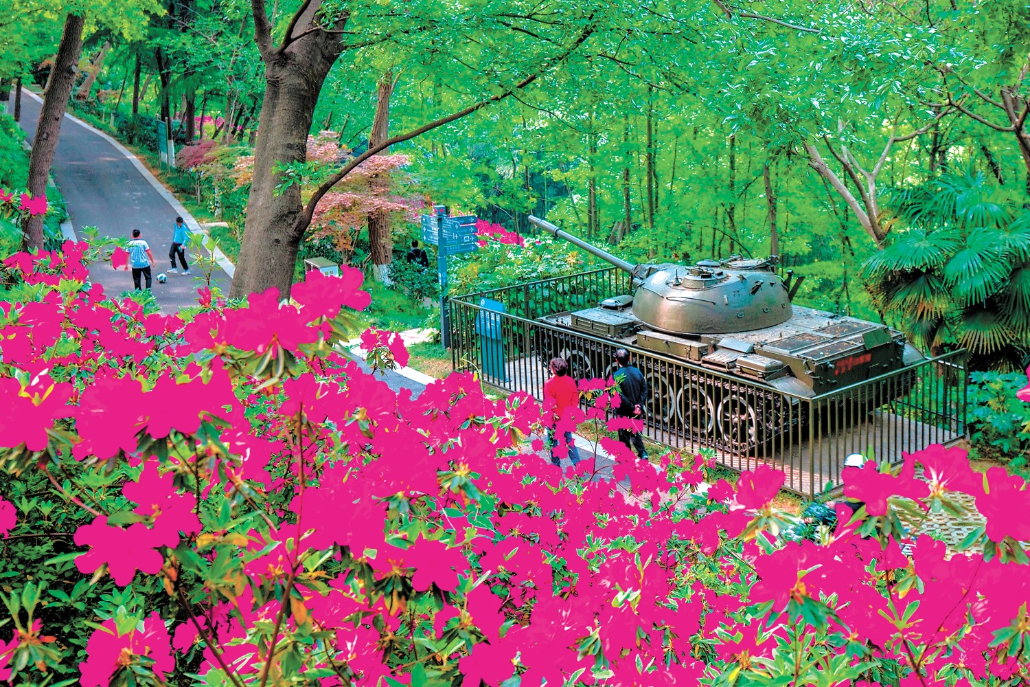南京国防园共有10多个新品种杜鹃花,花色有殷红、姹紫、杏粉、鹅黄等。各种颜色的杜鹃与苍翠山林及军事重兵器相映成趣,与晚樱、二月兰、满树红叶的枫树等一起形成了多彩春日景观。(任康)