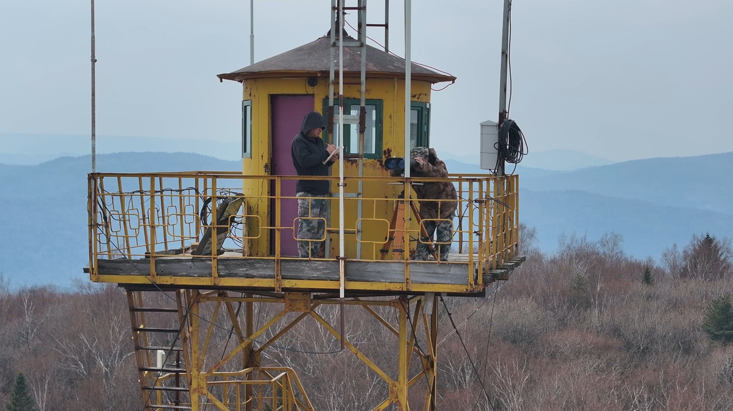 对青山瞭望塔是美溪林业局公司辖区内条件较为艰苦的瞭望塔之一。每次轮换驻防,尹宇亮和张念祥都要在山上连续工作90天。整个春天,他们要在这里看冰雪消融,看树木抽芽,看风起云涌。