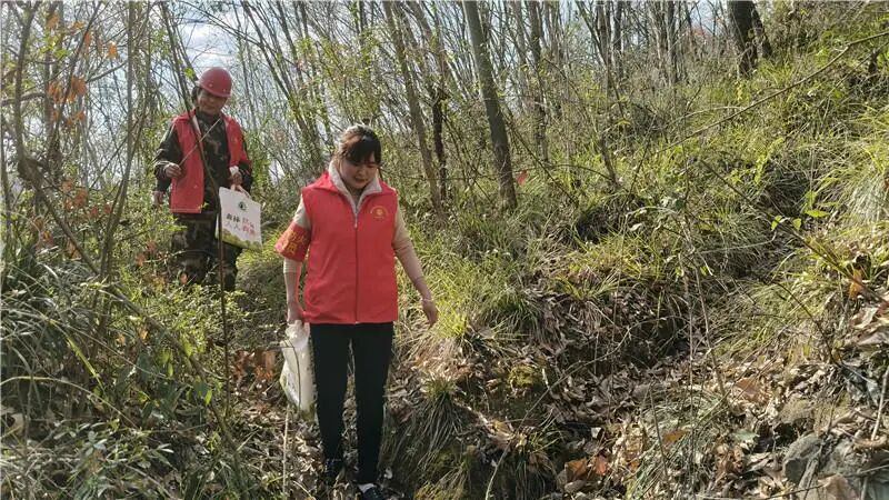3月5日,在旬阳市铜钱关镇赤岩社区,护林员吴世琴(右一)和队友在山林间巡护。