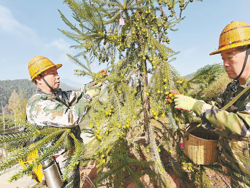 福建省洋口国有林场杉木第4代种子园内,工作人员在采收球果。