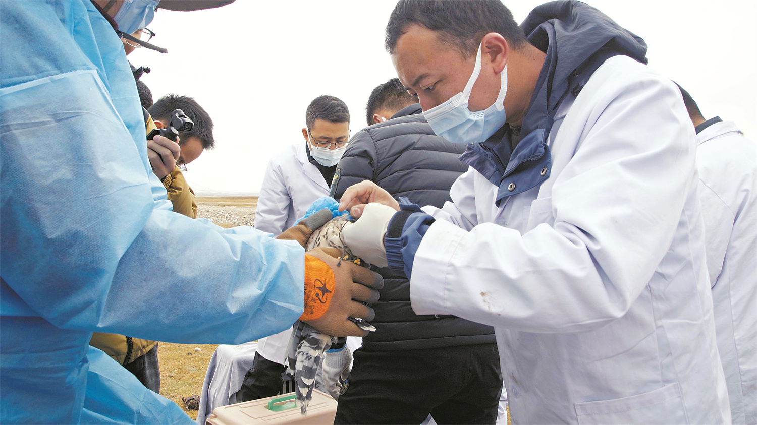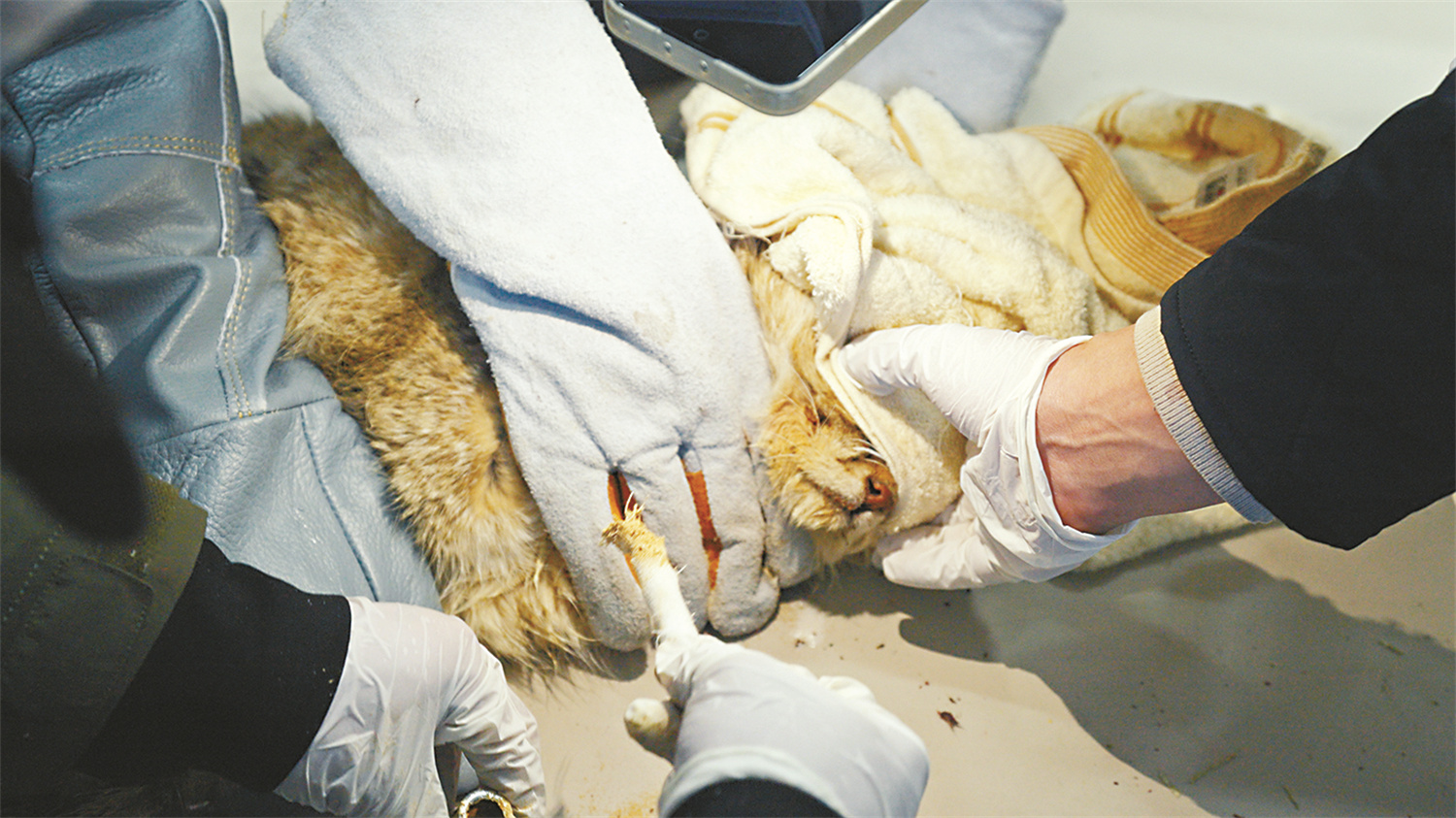 工作人员检查斑头雁患肢