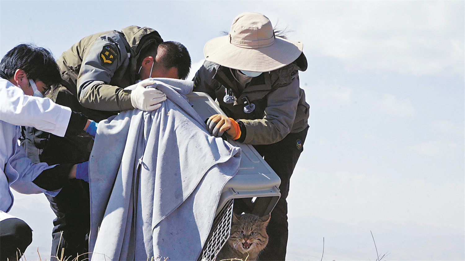 工作人员放归荒漠猫