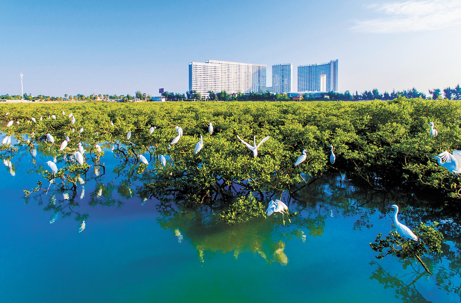 冬日,湛蓝的茅尾海上,龙门大桥如蜿蜒长龙,与桥下郁郁葱葱的红树林、飞来舞去的白鹭群,形成一幅相映成趣的美丽画卷。