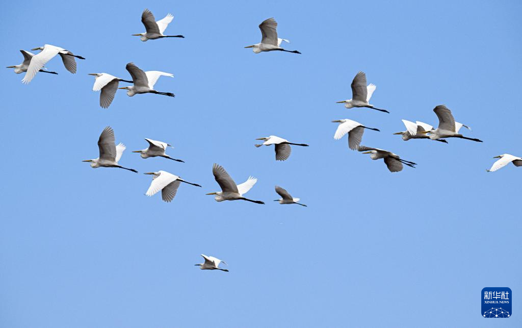 10月2日,成群的鹭鸟飞翔在海南昌江海尾国家湿地公园上空。