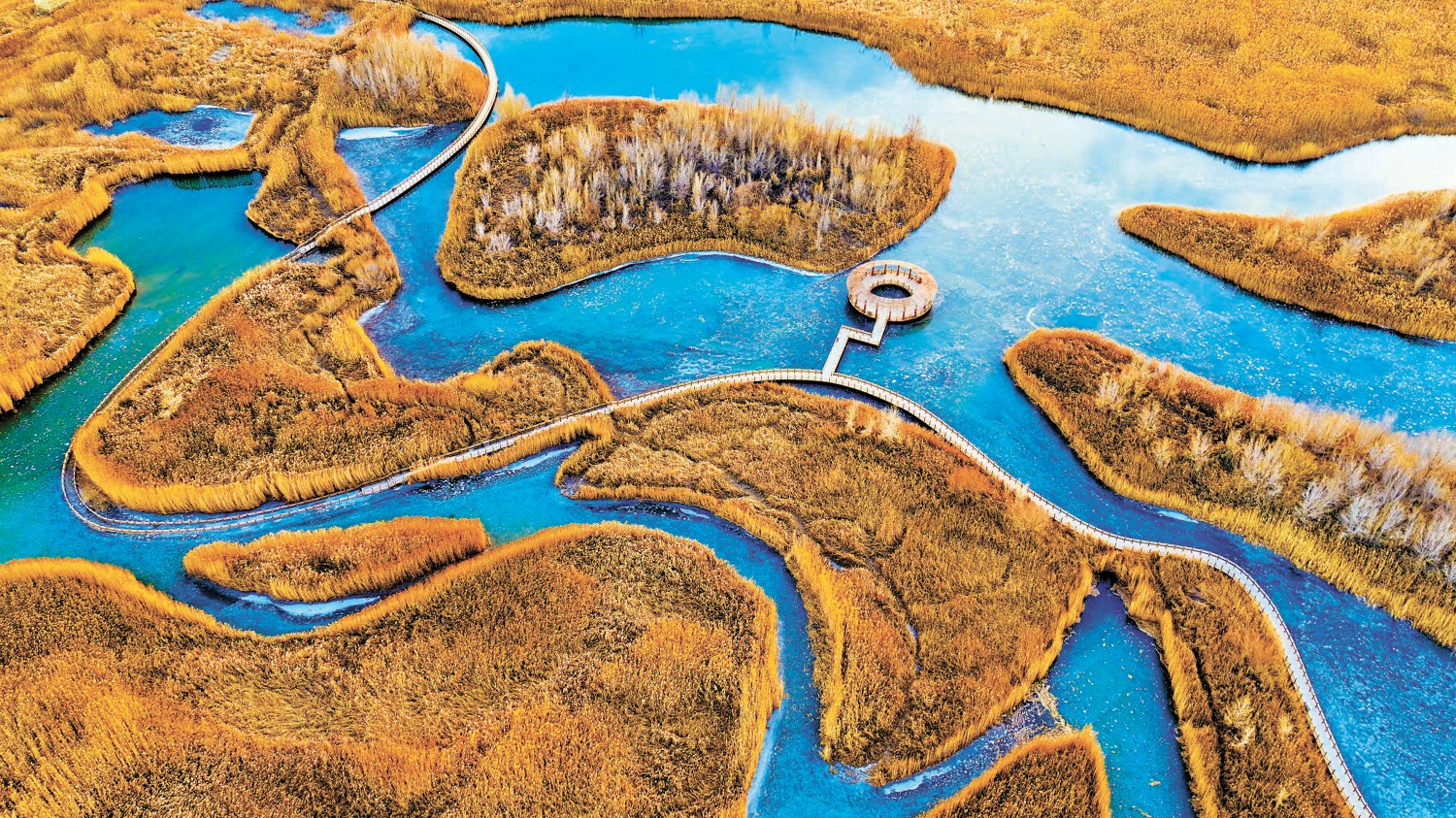 近日,在甘肃省张掖黑河湿地国家级自然保护区内,芦苇、蒲草经风霜浸染,尽数披上“金甲”。从高空俯瞰,夕阳下的芦苇荡似金色海洋,芦花随风摇曳似在轻舞,碧水成冰环绕其中,整个湿地宛如铺展的金色画卷,吸引了众多游客和摄影爱好者前来观赏和拍摄。