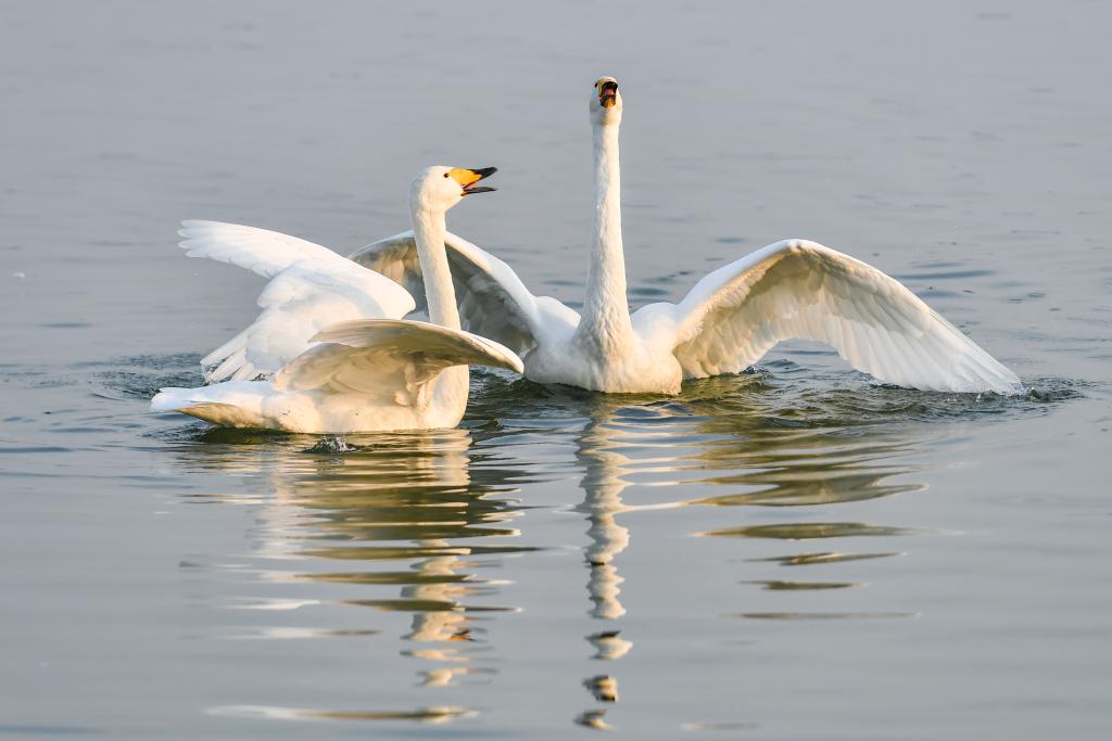 大天鹅在山西平陆黄河湿地栖息。新华社记者曹阳 摄