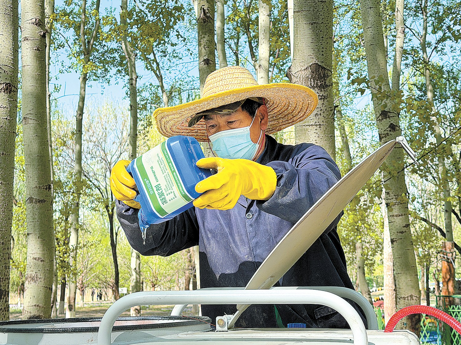 工人将凝絮剂与水按一定比例混合。北京市园林绿化局供图