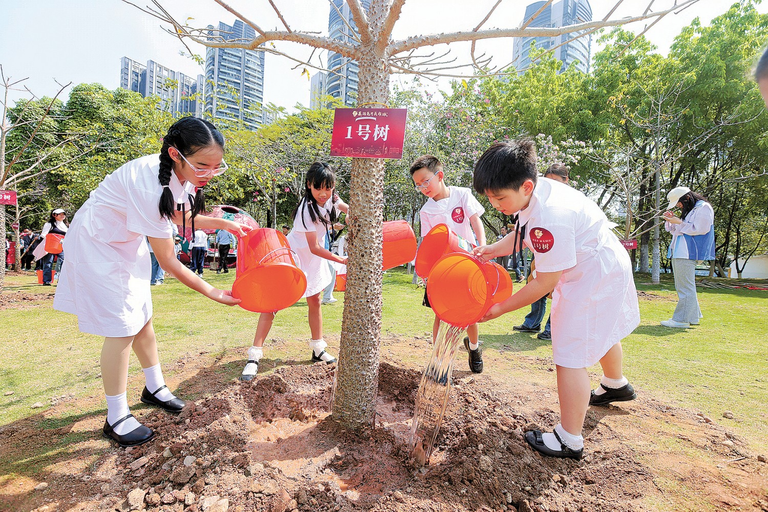 广州市南沙区儿童公园内,大湾区儿童代表为新植木棉浇水 方迎忠摄