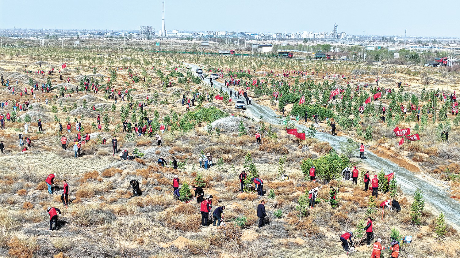 4月9日,甘肃省古浪县县直部门及相关乡镇干部职工在八步沙林场集中植树点开展2026年“绿满陇原”行动春季义务植树活动。