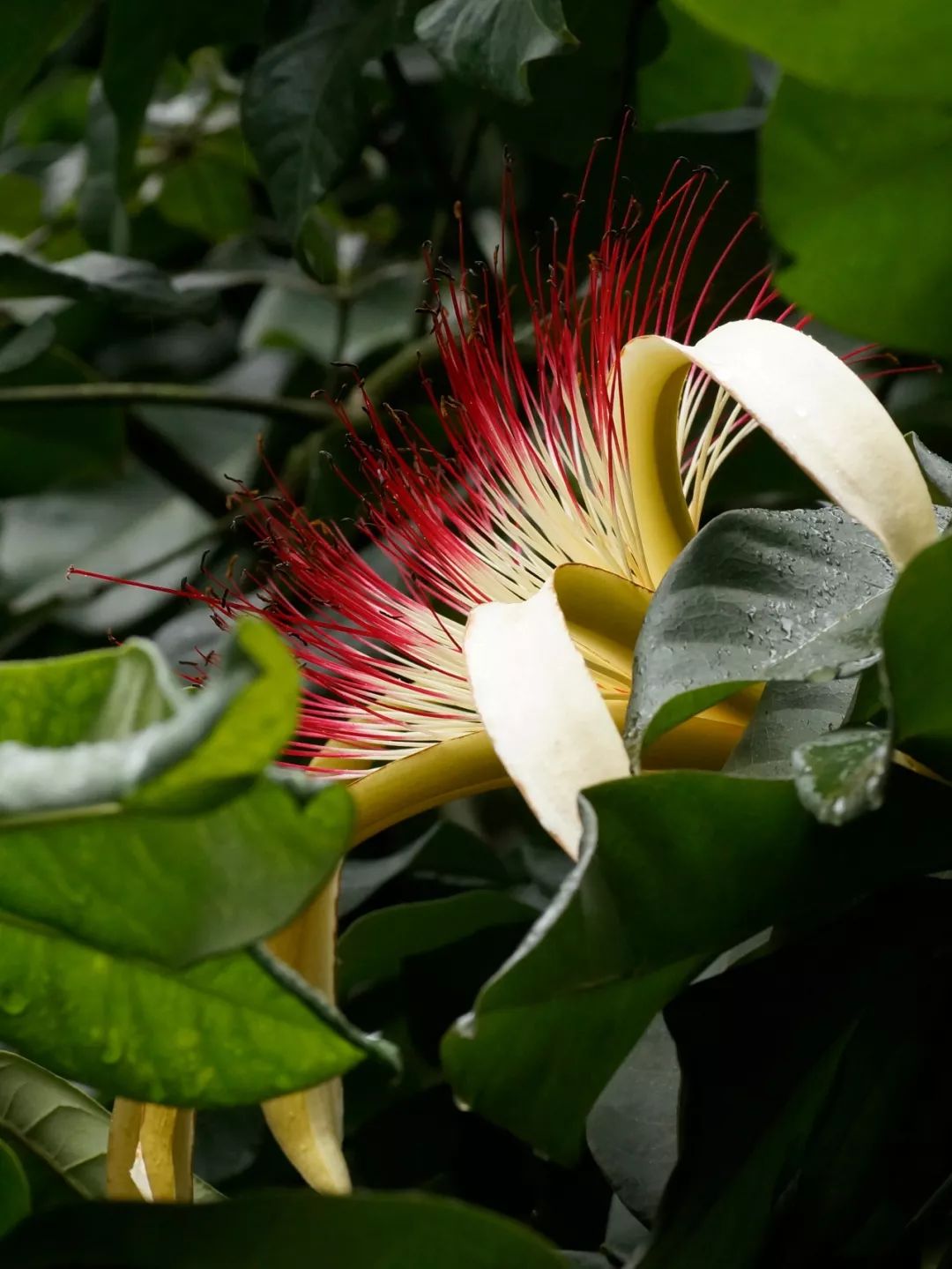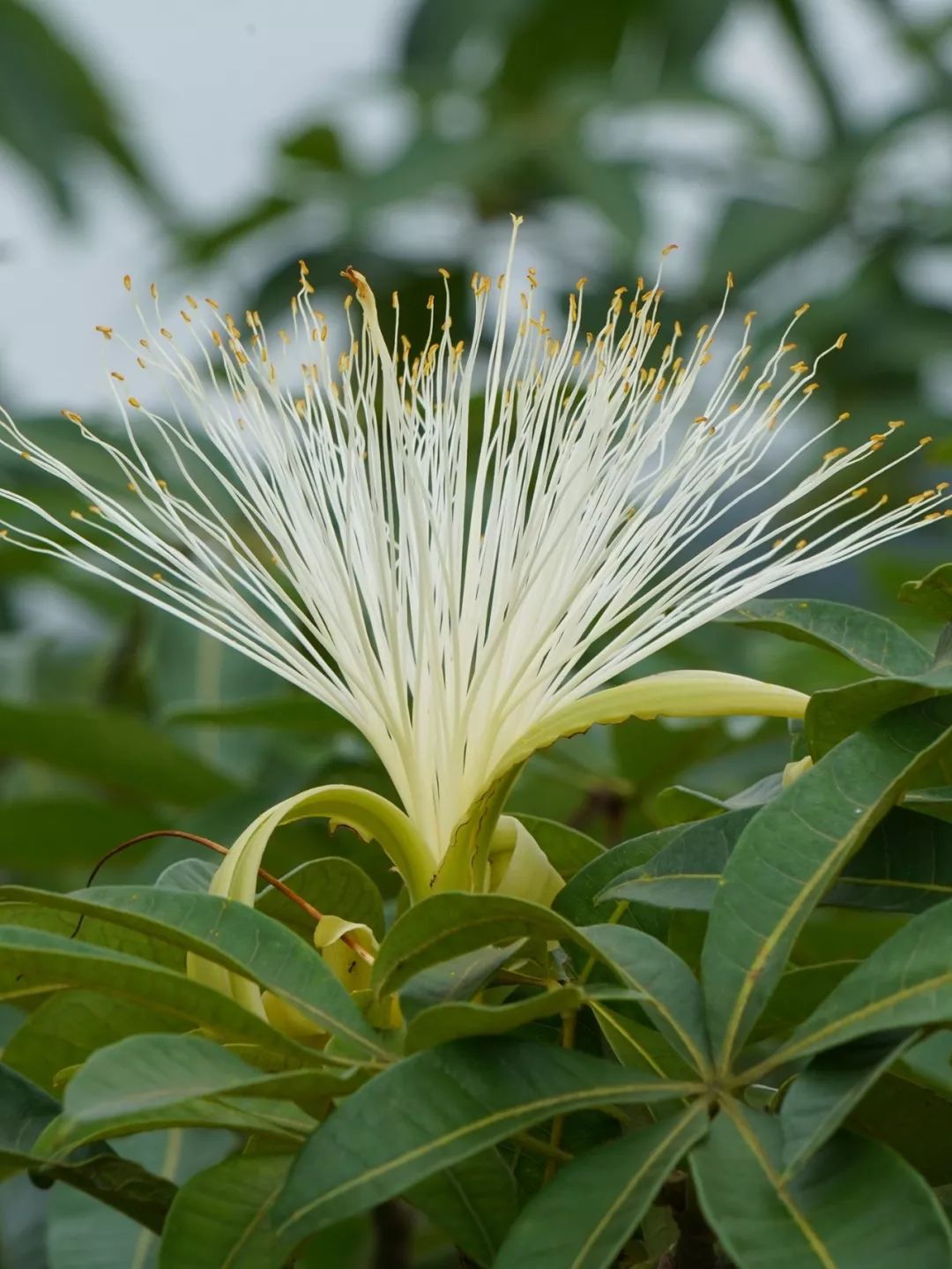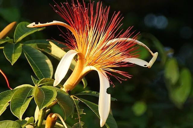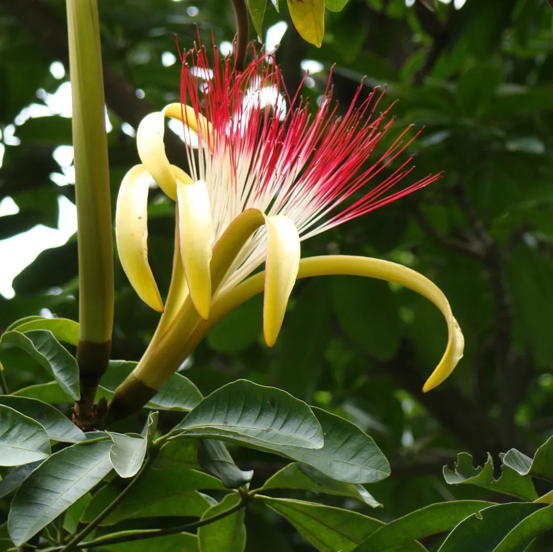 初夏时节,发财树就进入了花期,它的花瓣并不显眼,长长的卷起来像香蕉皮,但它的雄蕊又长又多,多到数不清,盛放时就像一朵炸开的烟花。前面我们提到,发财树通常是指瓜栗和光瓜栗这两种同属的植物,它们长得很相似,经常被人混淆,但如果看到雄蕊就一秒分清了:瓜栗的雄蕊是红色的,而光瓜栗则是白色的。