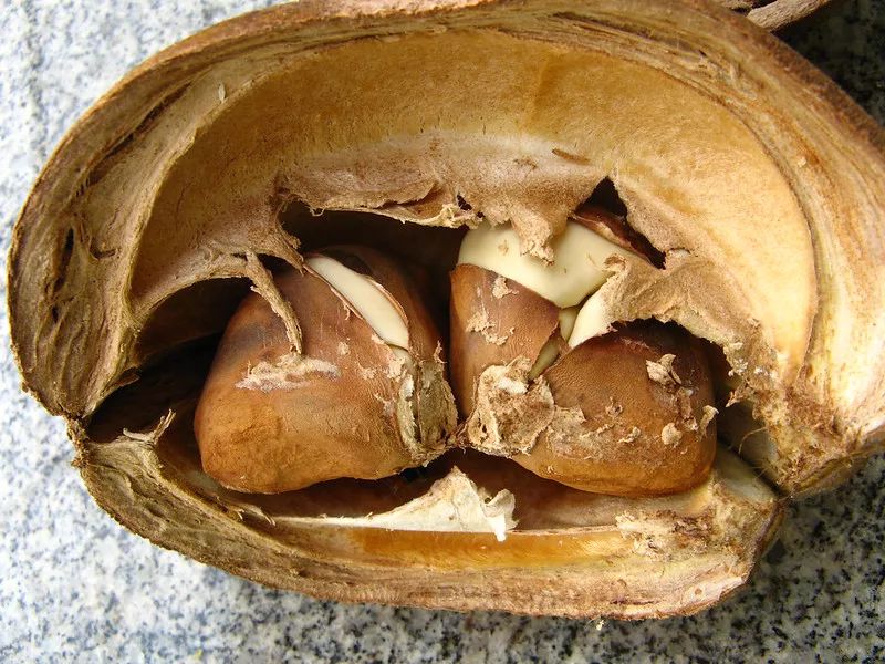 花后发财树会结出椭圆形的果实,形状有点像木瓜,而里面的种子则有点像栗子,这可能正是“瓜栗”这个名称的来源——而且发财树的种子还真和栗子一样,煮熟就可以吃,味道也差不多。发财树的果实成熟后会自己开裂,果皮内壁毛茸茸的有很多细小的棉毛,这也是它和木棉有亲缘关系的证据之一。
