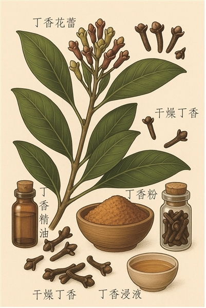 诗人笔下的丁香,又名紫丁香,是我国北方院子里木樨科的观赏花木,春末盛开,香气扑鼻。而古人“口衔丁香”的香气,却来自桃金娘科的丁香蒲桃尚未盛开的花蕾,这种花蕾在由绿转红时采收,晒干后兼具辛辣与苦甜口感,因为花苞形似钉子,又被称为“丁子香”。