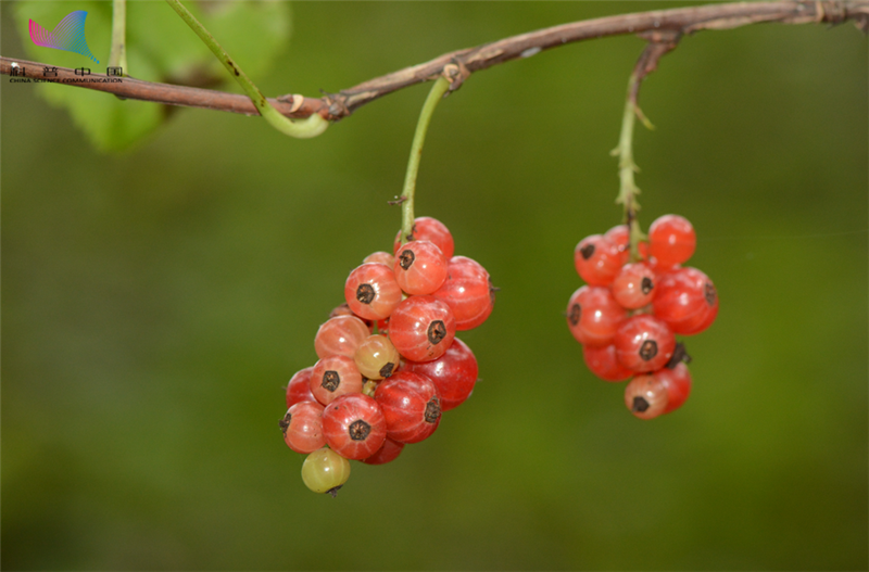 具有红艳艳浆果的东北茶藨子,其人工栽培近缘品种是水果蛋糕上常见的点缀,俗称醋栗。(沐先运摄)