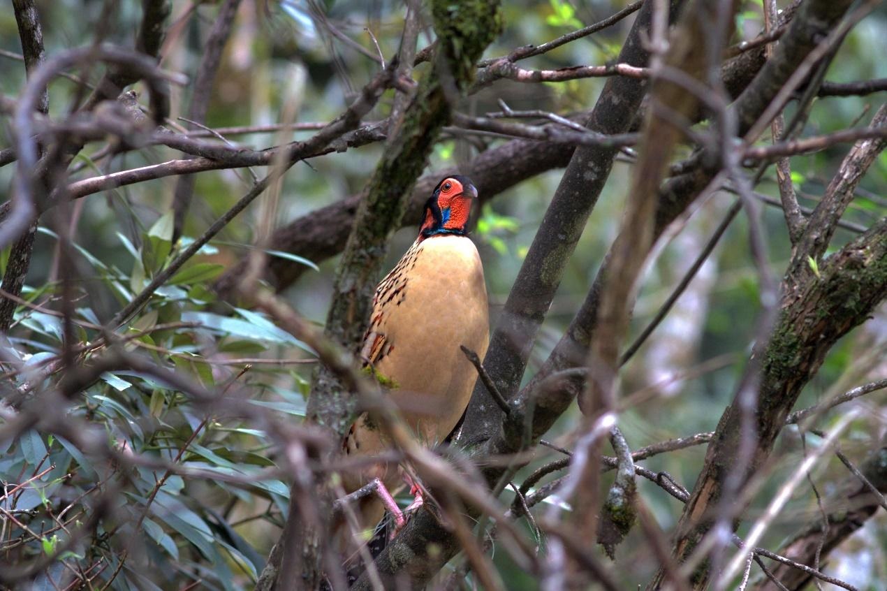 黄腹角雉活动隐蔽,爱在山林之间“躲猫猫”,常在茂密的林下灌丛和草丛中活动,发现危险信号便低头缩进草丛之间。