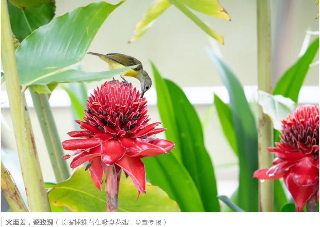 在西双版纳植物园里,能看到长嘴捕蛛鸟来给火炬姜传粉,鸟儿停在粗壮的花序中间,把嘴插进开放的花朵里,头下侧就会沾上花粉,然后传到柱头上。