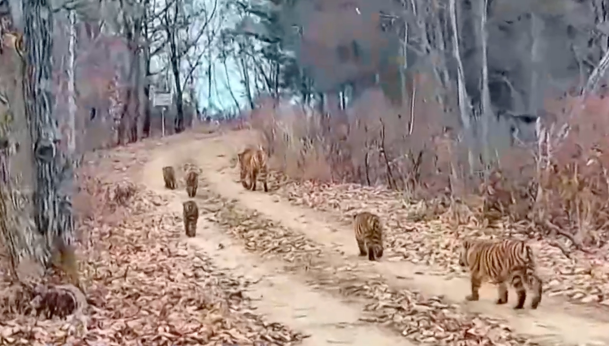东北虎豹国家公园管理局局长段兆刚:11月6日,我们监测到一只雌虎带着五只幼崽的珍贵影像。8日,我们再次拍摄到这个东北虎家庭的“六虎同框”。