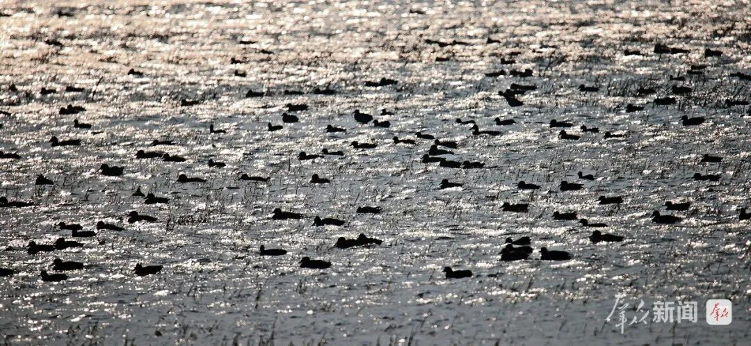 成千上万只白骨顶鸡在水面游弋。