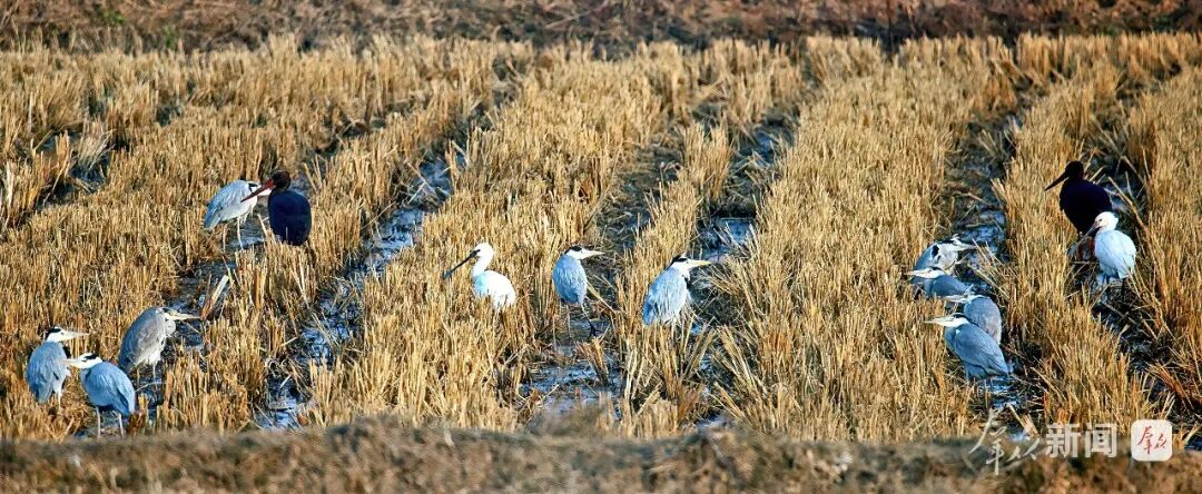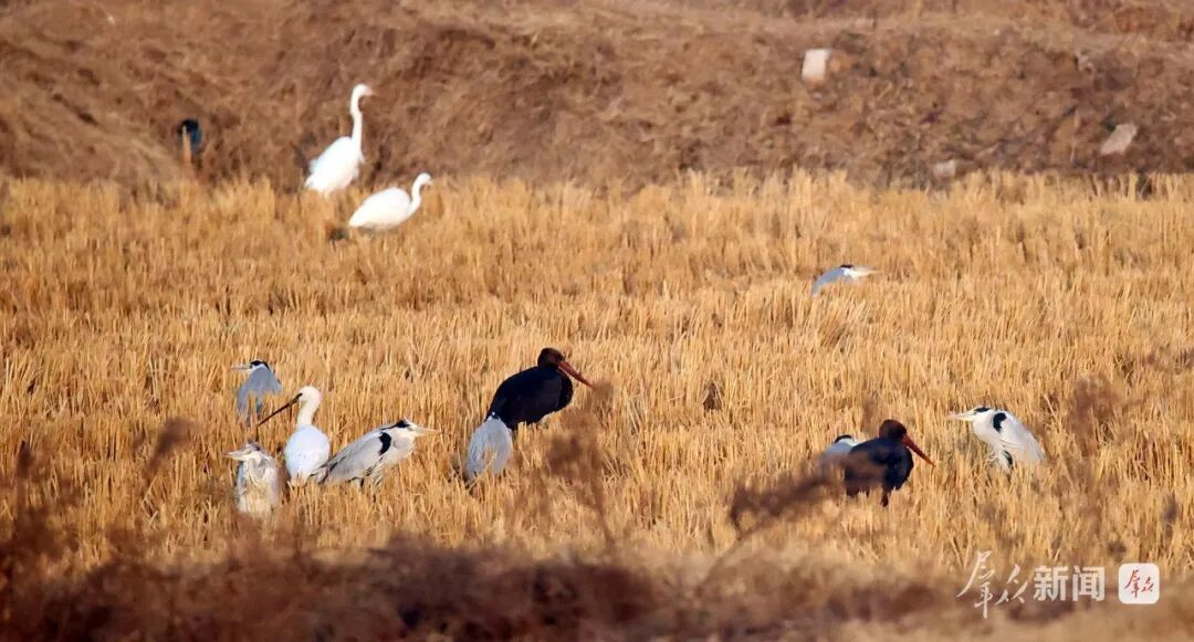 国家一级重点保护动物黑鹳现身水域,与苍鹭、白鹭、白琵鹭等多种水鸟同框栖息觅食,构成和谐生态图景。